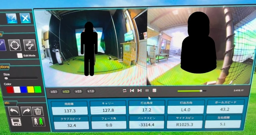 特筆すべきは、ご自身のスイングを正面と後方の2方向から映像で確認できる点です。0.1倍速から選べるスロー再生機能を使い、表示されるデータと照らし合わせることで、「今のスイングでなぜこの弾道になったのか」が一目瞭然になります。ご自身の感覚と実際の動きのズレを修正する、非常に質の高い練習が可能になります。