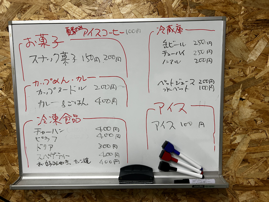 そこには冷蔵庫があり、中にはジュース、缶ビールや缶チューハイなどのアルコール、カップ麺、アイスクリームまで並んでいます。