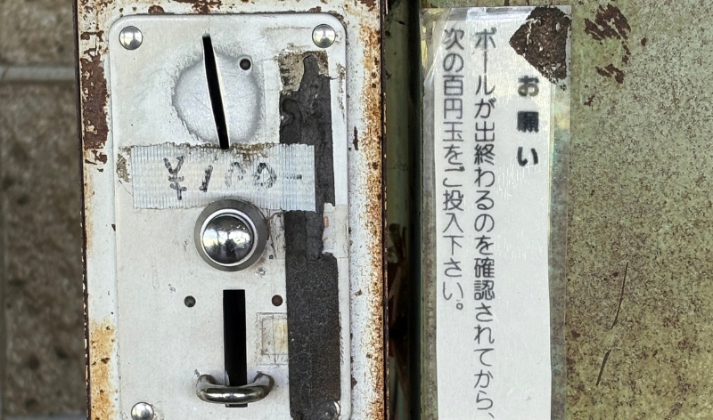 100円硬貨を投入するとボールが出ます。連続投入すると一時的に出なくなる場合があるため、間隔を空けてご利用ください。