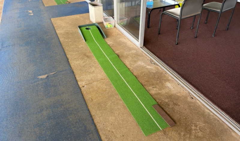 パター練習は一般的なパターマットで行います。ショット練習後に、まっすぐ打つ感覚を確認している常連もいます。