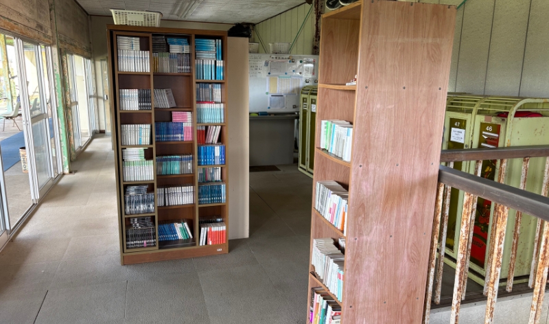 2Fには小説の本棚があり、スタッフへ申告すれば貸し出しを受けられます(無料)。応接スペースではお茶を飲みながらくつろげます。
