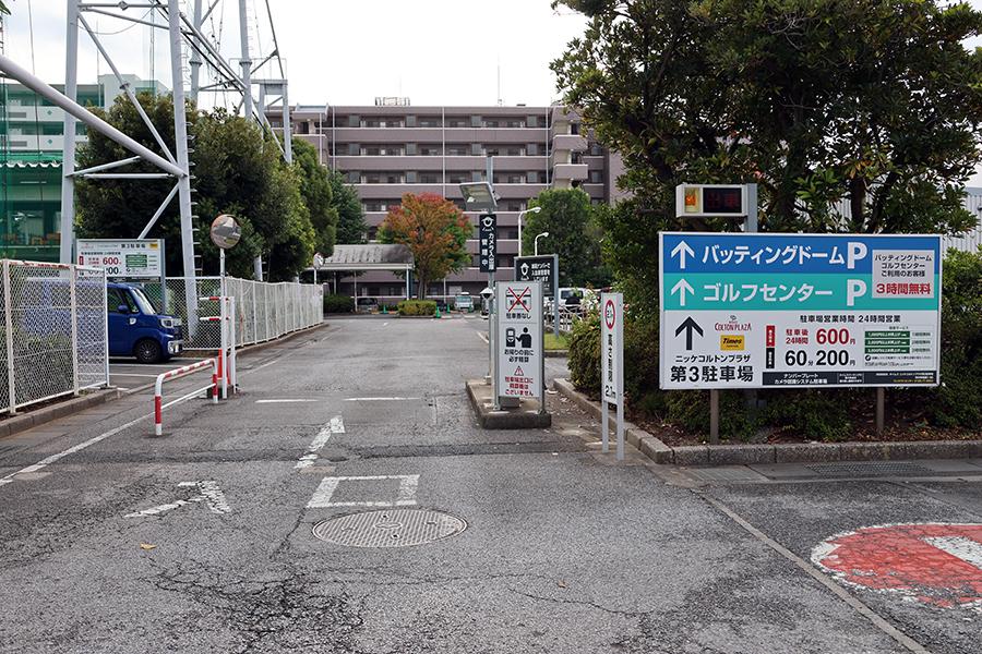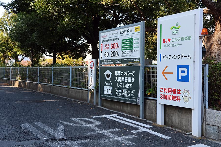 入場ゲートが無い駐車スペースは、車両ナンバーを自動で読み取るカメラが管理中。ドライビングレンジや同じ敷地内にある「バッティングドーム」を利用すれば、最大3時間の駐車料金が無料となります。