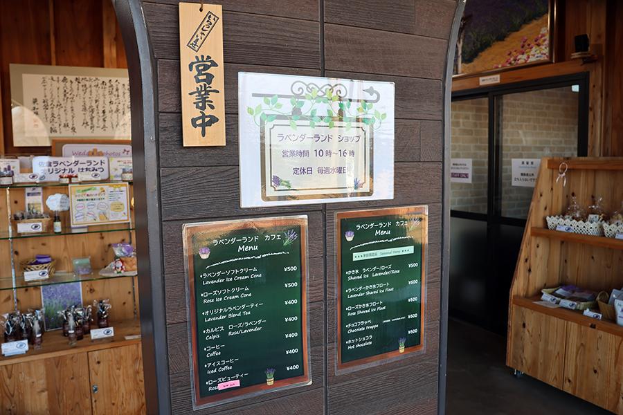 ショップには、ラベンダーやローズを使ったカフェメニューや美容アイテムなどが取り揃えられています。