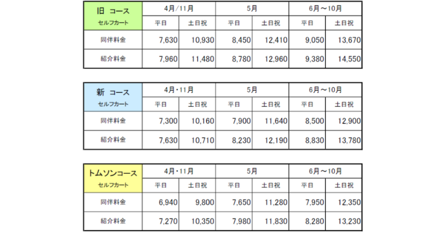3コースそれぞれに料金設定があり、平日は7,000円台から、土日祝日は10,000円以上が目安です。