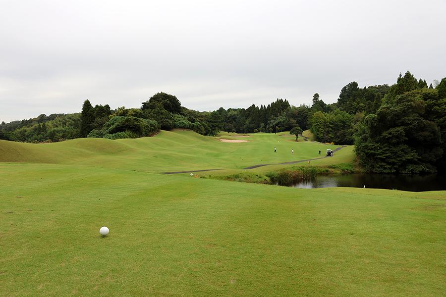 続く11番ミドル(同343yard)は、手前の池は関係ナシで、むしろカートの右奥にある“見えない池”に注意が必要です。