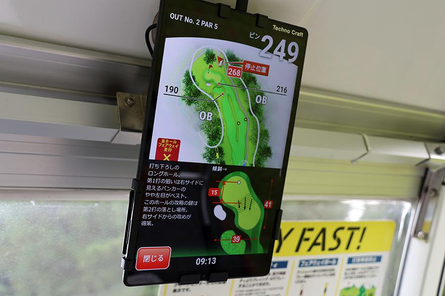 乗用カートは自走式で、最新タイプのナビを搭載。