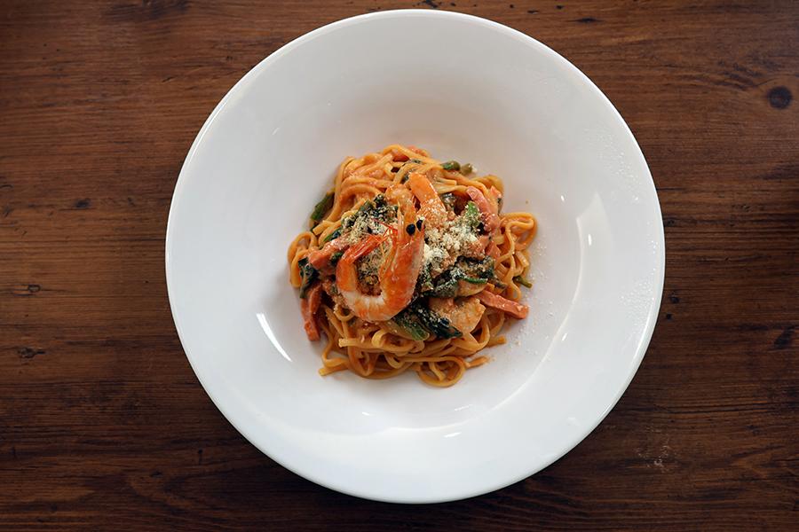 この日は、追加料金ナシの「海老クリームパスタ」をセレクト。タッチパネルからオーダーし、しばらく待っていると、