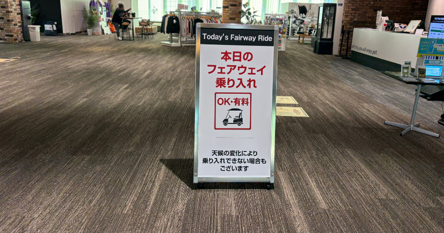 キャディーマスター室ではコース案内が看板で記されています。自分のスタートホールへ向かう前に、練習場で調整を行いましょう。