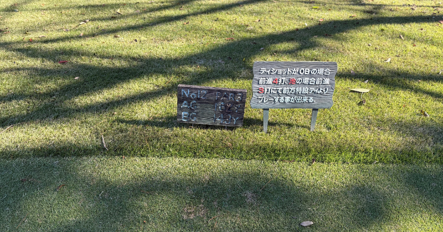 西IN:No.12は池越えのショートホールです。しかも砲台グリーンになっているため、確実にティーショットでグリーンに乗せるには高めの弾道が必要です。