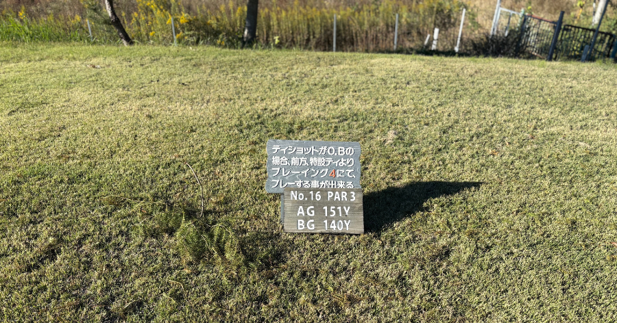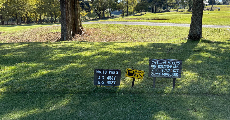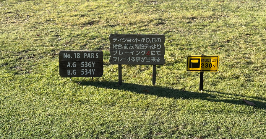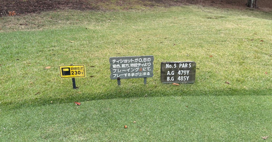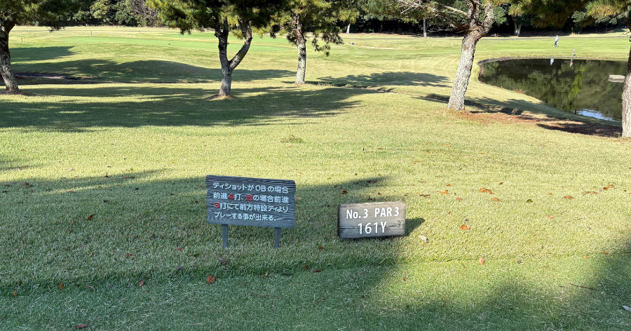 お昼の腹ごしらえを済ませた最初のホールがロングホールです。安全にティーショットを打とうと考えるとチーピンが出て、左サイドのOBに捕まりやすいホールになります。安全に3オンを狙いたいホールです。