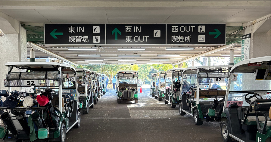 セントラルGCのプレースタイルは、4人乗り電動カートによるセルフプレーが基本。全カートに最新のGPSナビが搭載されており、残り距離やピン位置、前組との間隔まで一目で確認できます。