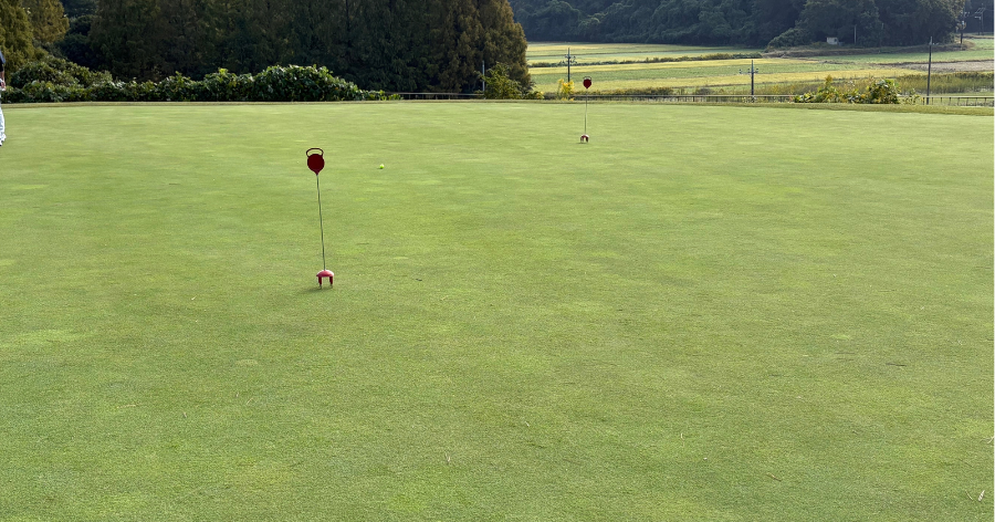 練習グリーンはコースと同等の早さで調整してあり、この日は「10.5フィート」で休日にしては早めのセッティングになっていました。