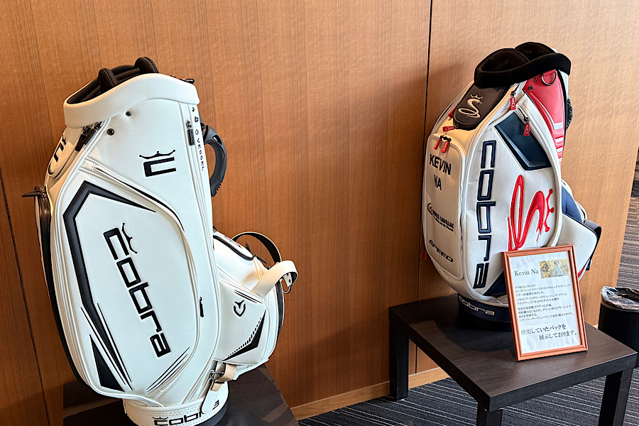 レストランに上がる階段のそばにPGAツアー選手のケビン・ナとリッキー・ファウラーの実使用キャディバッグが飾られていました!