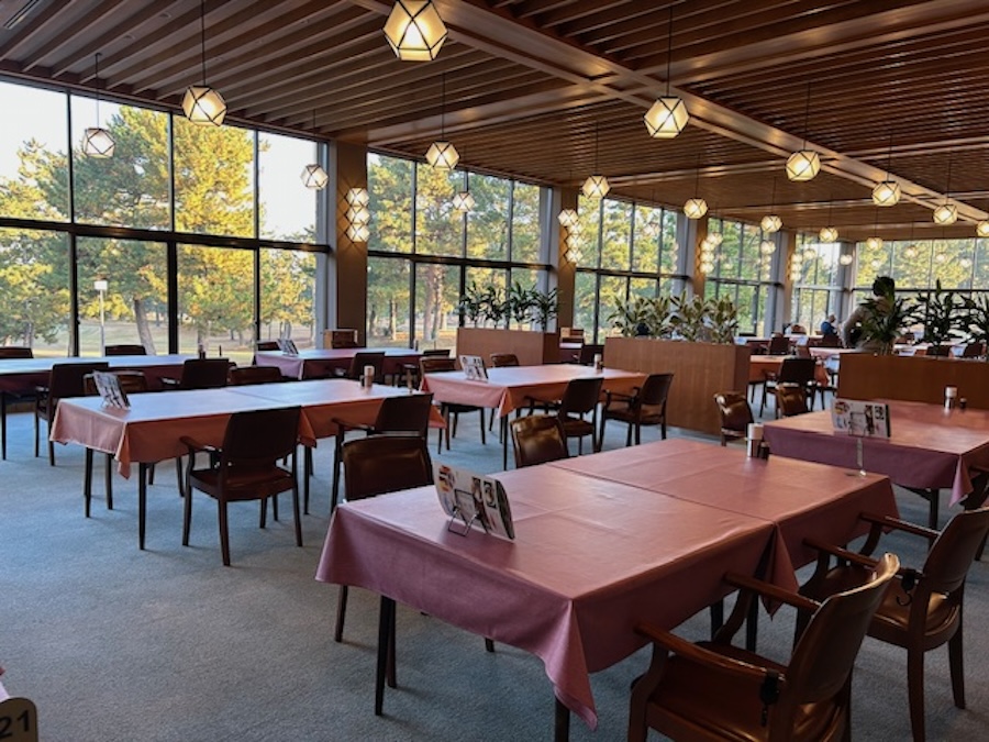 大きな窓からはコースの緑が見渡せ、食事を楽しみながらリラックスできる空間が広がっています。